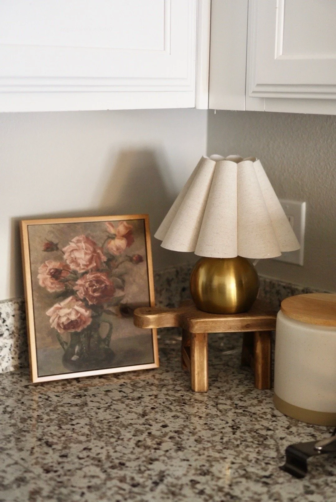 You can view the TikTok I filmed showing how I styled the counter, here. I have a small budget so I wanted something pretty, yet very affordable. I have been eyeing this floral framed wall art, small lamp, and wooden pedestal and finally decided to buy all 3 items thinking theyβd go great together in the corner. I love that the lamp has a scalloped shadeβitβs my favorite purchase right now! You can find this lamp on my TikTok Shop, too.